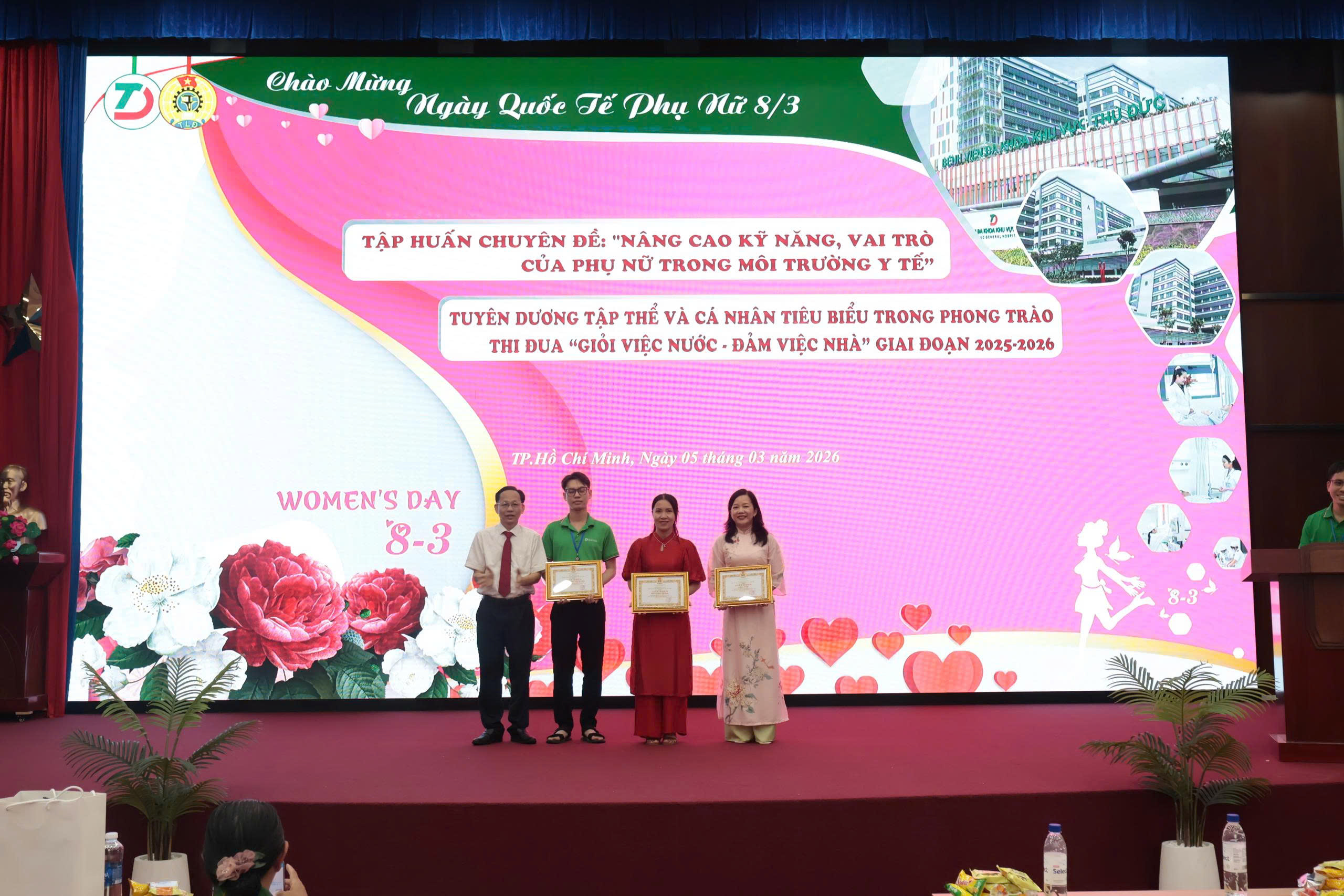 Một nội dung nổi bật của chương trình là tuyên dương, khen thưởng phong trào thi đua “Giỏi việc nước – Đảm việc nhà” giai đoạn 2025–2026. Đây là phong trào có ý nghĩa thiết thực, khuyến khích nữ cán bộ, viên chức và người lao động không ngừng nỗ lực hoàn thành tốt nhiệm vụ chuyên môn, đồng thời giữ gìn và xây dựng mái ấm gia đình. Dịp này, 52 cá nhân và 3 tập thể tiêu biểu đã được Công đoàn Bệnh viện khen thưởng vì những thành tích xuất sắc trong công tác và phong trào thi đua.