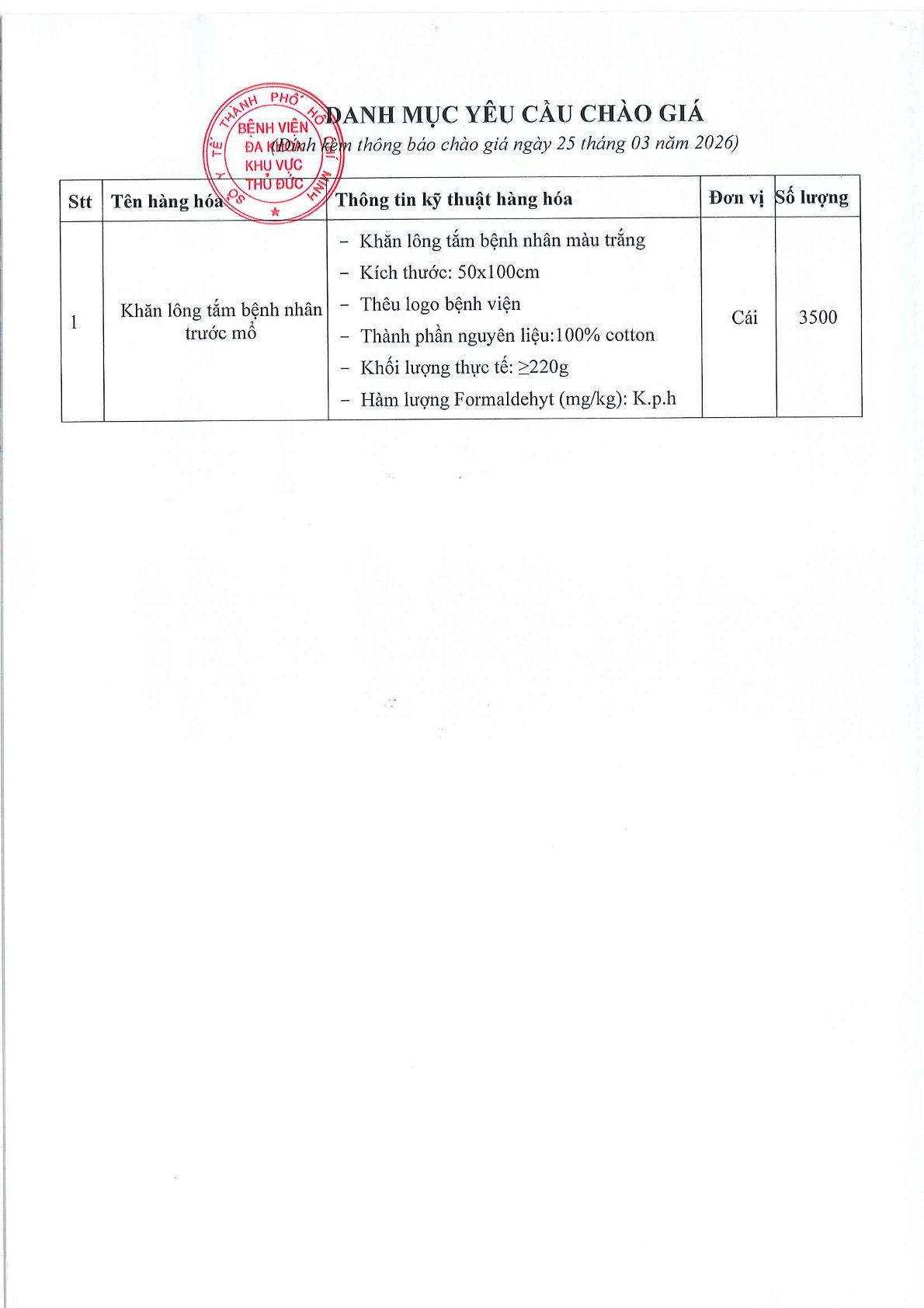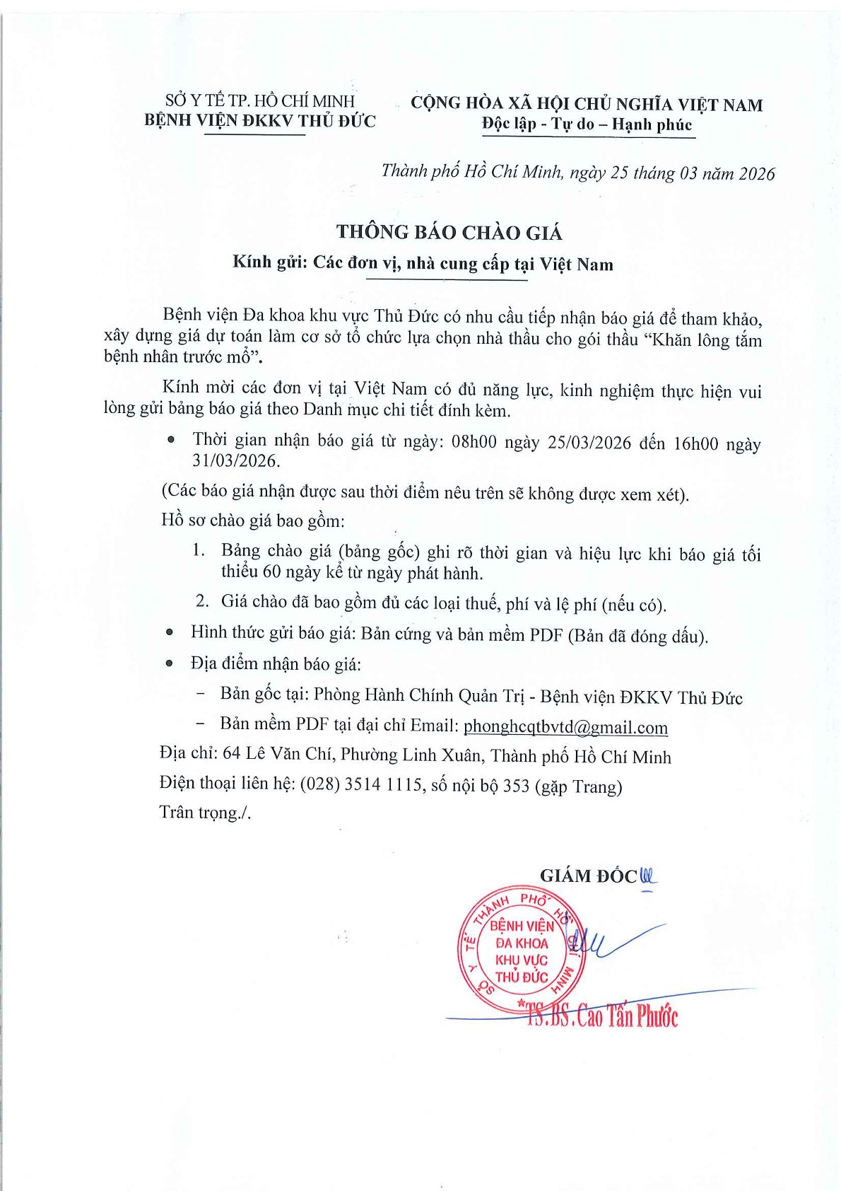 Phòng Hành Chính Quản Trị _ Thông báo Chào Giá _ CV26.03