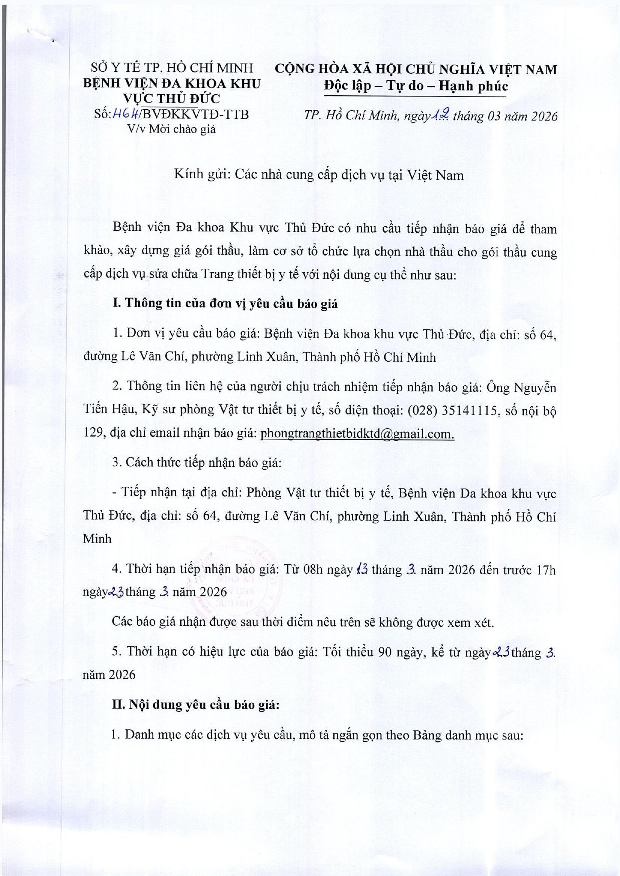 Phòng Trang Thiết Bị - Vật Tư Y Tế _ Thông báo Chào Giá _ CV464 Bởi supadmin -12-03-2026 +++ Link các danh sách đính kèm: - Thư mời yêu cầu báo giá và phụ lục - Mẫu phụ lục báo giá