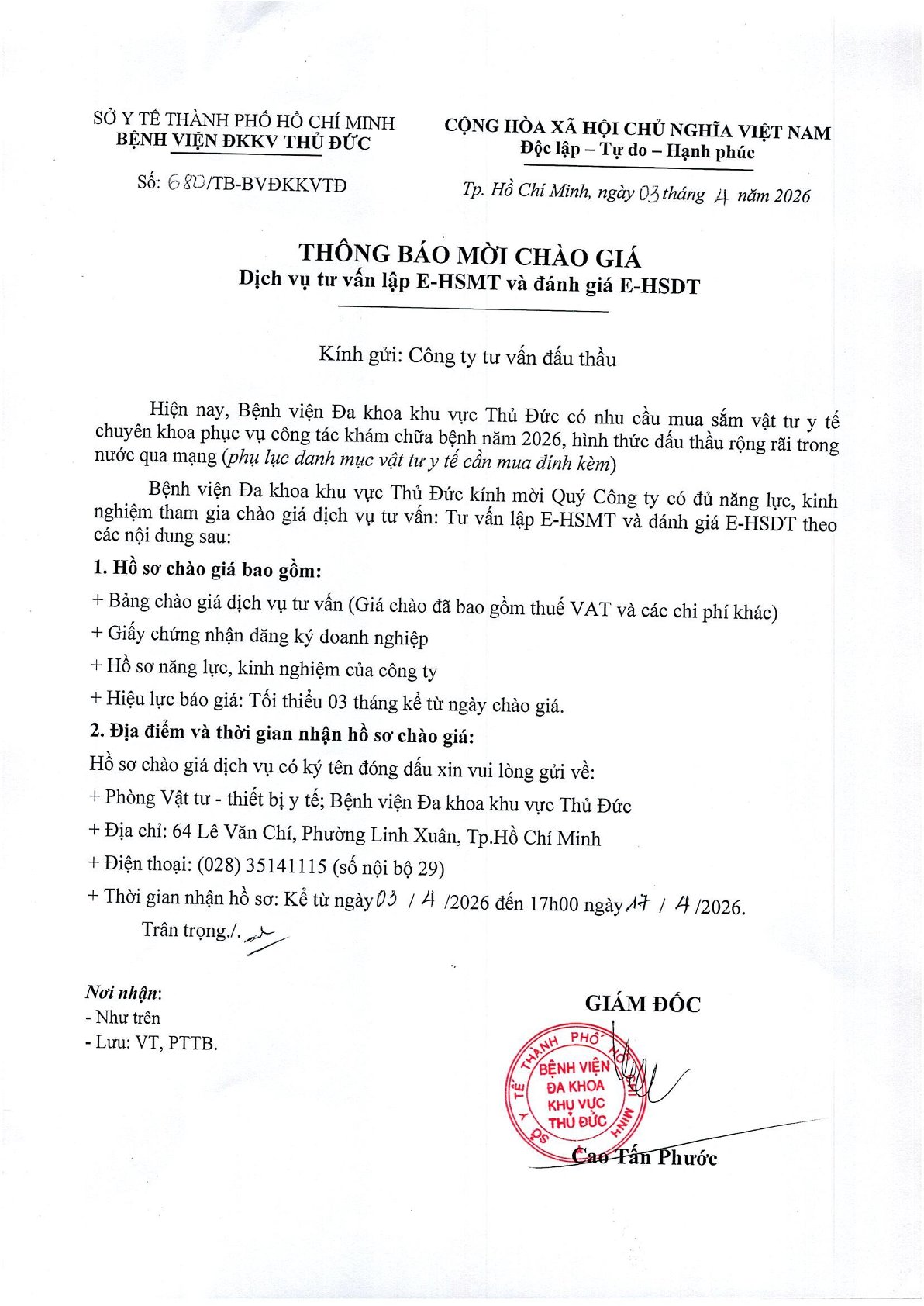 Phòng Trang Thiết Bị - Vật Tư Y Tế _ Thông báo Chào Giá _ CV680 Bởi supadmin -03-04-2026 ... Danh mục hàng hóa đính kèm : Tại đây