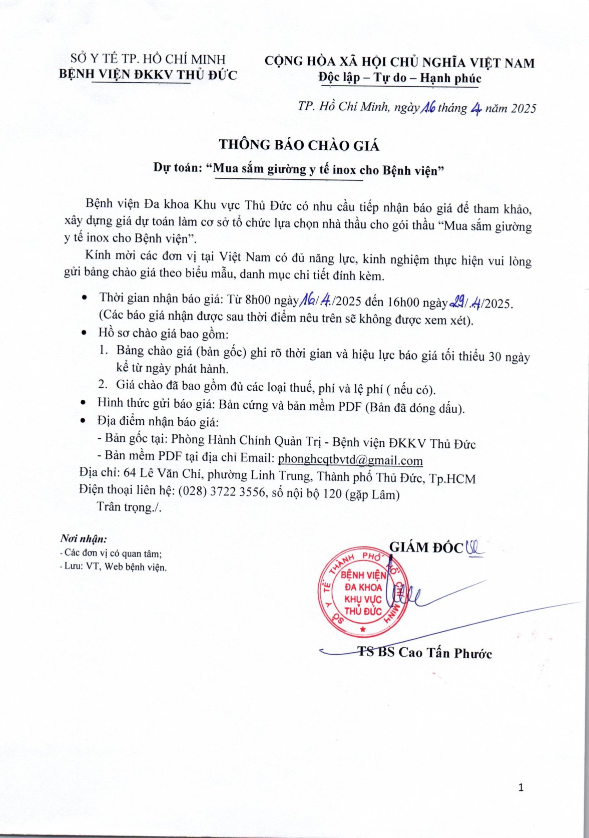 THÔNG BÁO CHÀO GIÁ - DỰ TOÁN:" MUA SẮM GIƯỜNG Y TẾ INOX CHO BỆNH VIỆN"