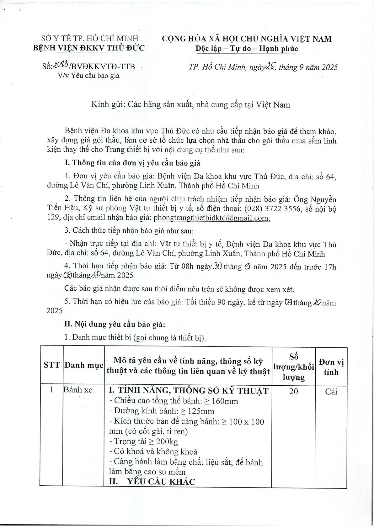 Thư Mời Báo Giá "V/v Yêu cầu báo giá" - Kính gửi: Các hãng sản xuất, nhà cung cấp tại Việt Nam Bởi supadmin -29-09-2025 ... +++ Link các danh sách đính kèm: - Thư mời yêu cầu báo giá và phụ lục - Mẫu phụ lục báo giá