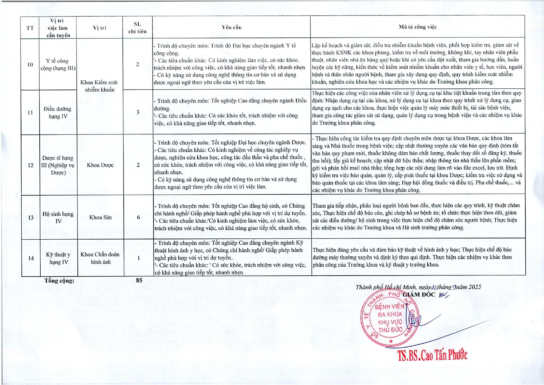 - - - -BẢNG TỔNG HỢP CHỈ TIÊU, CƠ CẤU ĐIỀU KIỆN TUYỂN DỤNG LAO ĐỘNG THÁNG 09/2025 - - - -