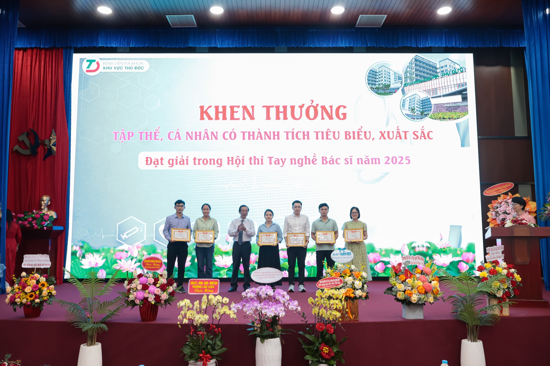 Bên cạnh đó, Bệnh viện cũng đã long trọng tổ chức khen thưởng các tập thể, cá nhân có thành tích tiêu biểu, xuất sắc: Trao Bằng khen của Chủ tịch Ủy ban nhân dân Thành phố; danh hiệu Chiến sĩ thi đua cơ sở năm 2024; tặng Giấy Biểu dương của Giám đốc Bệnh viện cho các tập thể, cá nhân gương điển hình tiên tiến tiêu biểu trong phong trào thi đua của Bệnh viện giai đoạn 2020 – 2025; Biểu dương các cá nhân có thành tích xuất sắc trong Hội thi tay nghề Bác sĩ năm 2025; Biểu dương các cá nhân gương “Người tốt, việc tốt”; tặng Giấy khen của Đảng ủy Bệnh viện cho Chi bộ, đảng viên xuất sắc năm 2025.