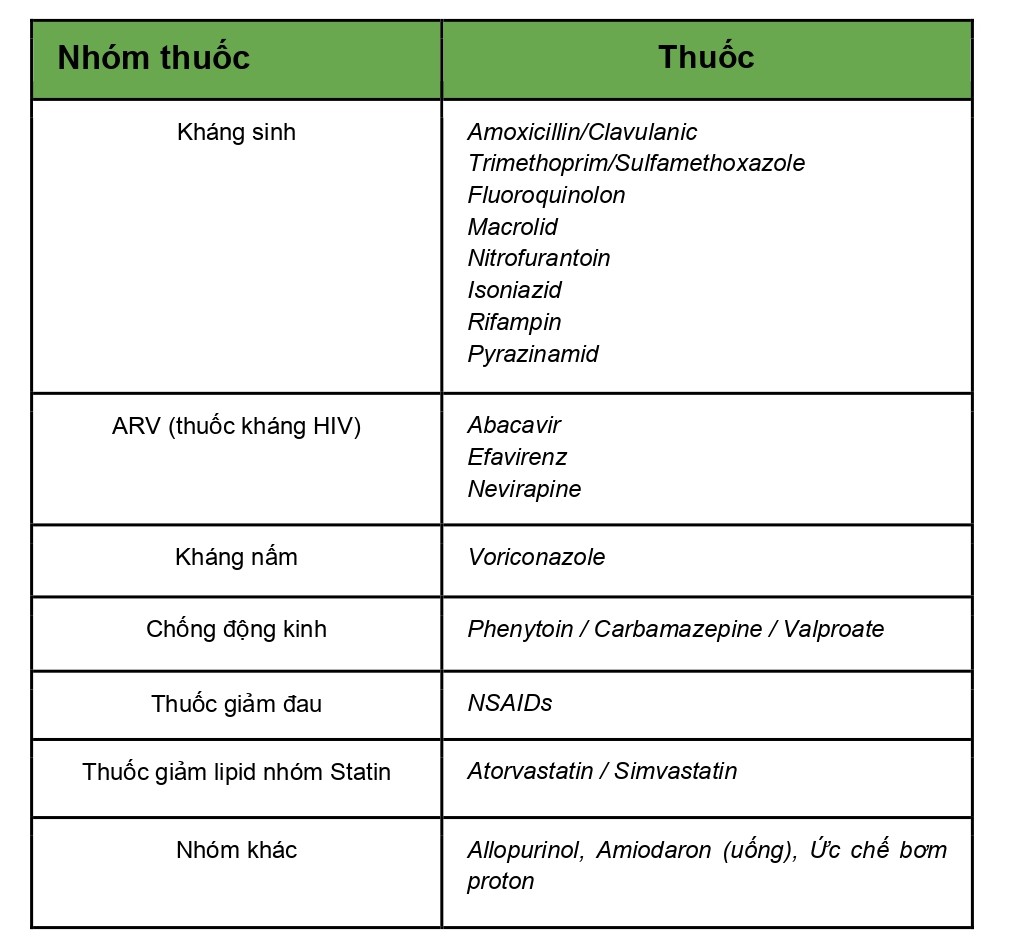 Trên 60% trường hợp DILI liên quan đến kháng sinh và thuốc chống động kinh. Các hướng dẫn lâm sàng về DILI đặc ứng của Trường môn Tiêu hóa Hoa Kỳ (American College of Gastroenterology-ACG)đã xác định các thuốc phổ biến nhất và được mô tả chi tiết liên quan đến DILI cũng như loại tổn thương gan. Cụ thể dưới bảng sau: