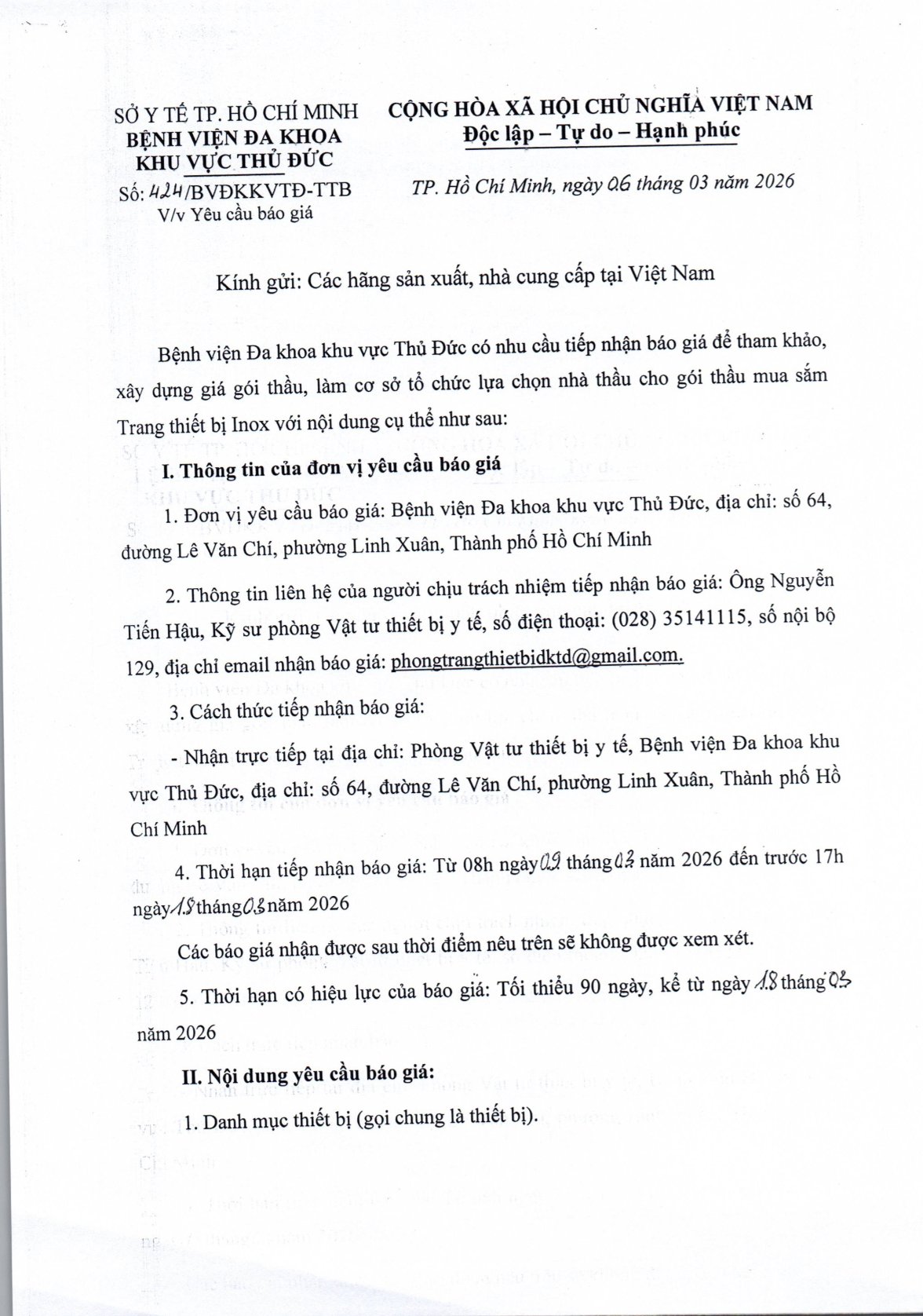 Phòng Trang Thiết Bị - Vật Tư Y Tế _ Thông báo Chào Giá _ CV424 Bởi supadmin -07-03-2026 ... +++ Link các danh sách đính kèm: - Thư mời yêu cầu báo giá và phụ lục - Mẫu phụ lục báo giá