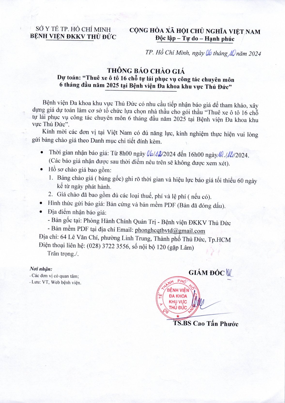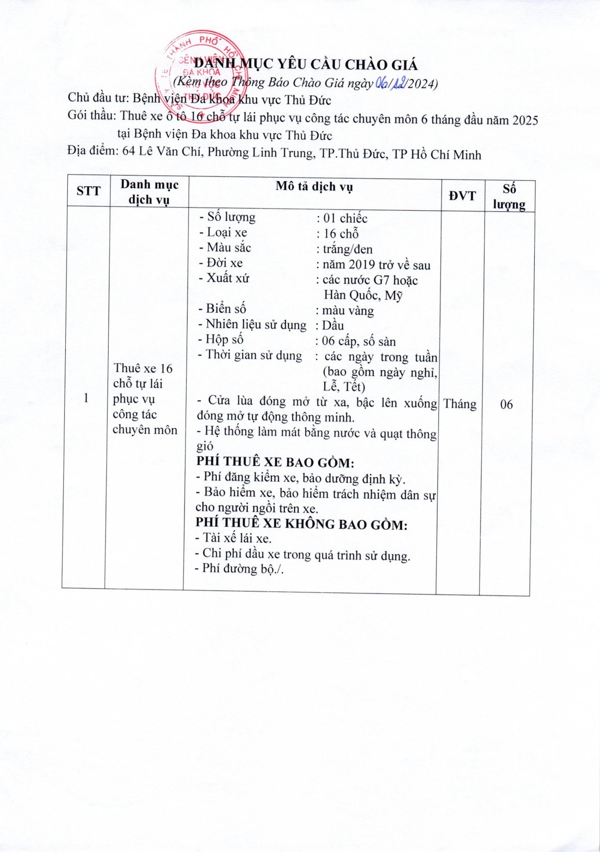 THÔNG BÁO CHÀO GIÁ - DỰ TOÁN: "THUÊ XE Ô TÔ 16 CHỖ TỰ LÁI PHỤC VỤ CÔNG TÁC CHUYÊN MÔN 6 THÁNG ĐẦU NĂM 2025 TẠI BỆNH VIỆN ĐA KHOA KHU VỰC THỦ ĐỨC"