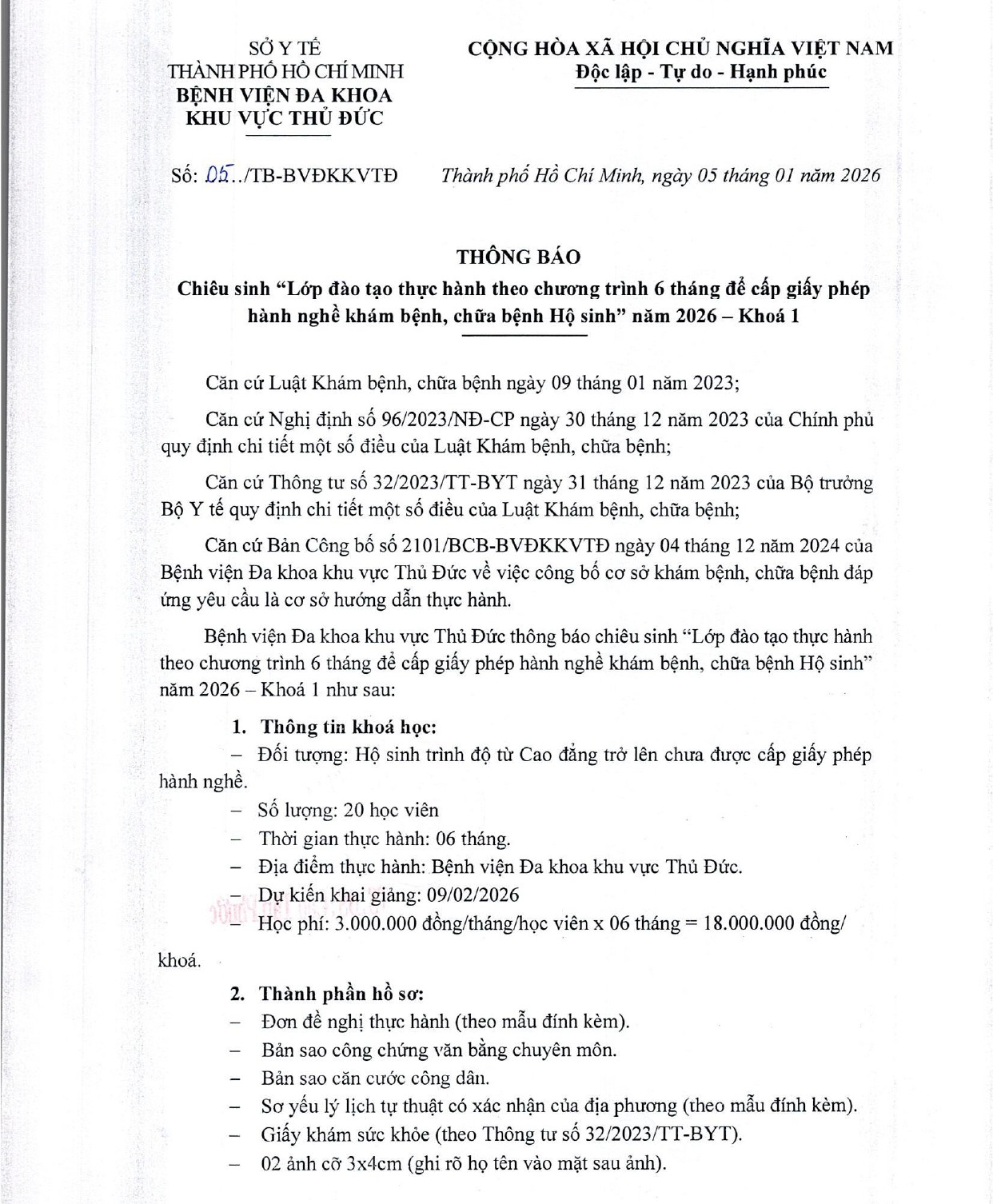 Thông báo: Chiếu sinh "Lớp đào tạo thực hành theo chương trình 6 tháng để cấp giấy phép hành nghề khám bệnh, chữa bệnh Hộ sinh" năm 2026 - Khóa 1 +++ Link các tệp đính kèm: - Mẫu đơn đề nghị thực hành NĐ96 - Mẫu Sơ yếu lý lịch tự thuật
