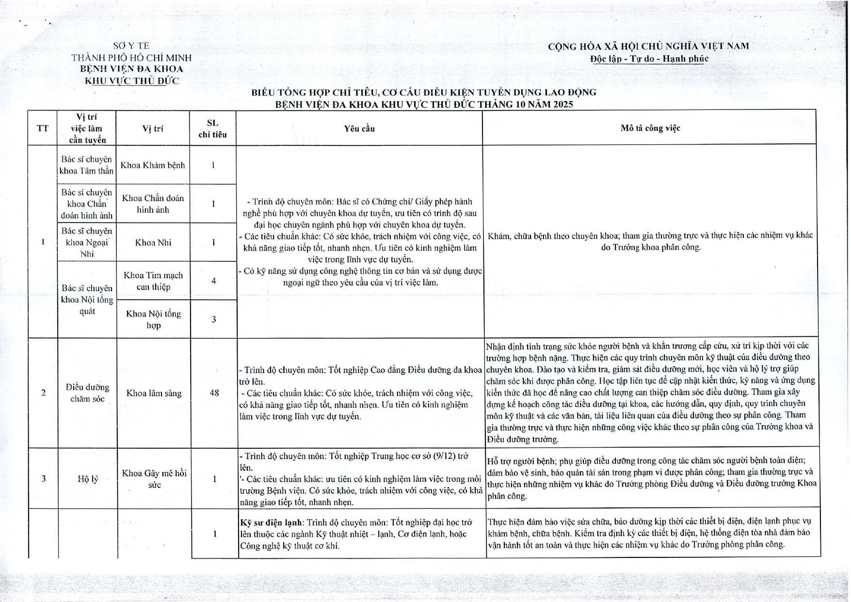 - - - - - - - - -BẢNG TỔNG HỢP CHỈ TIÊU, CƠ CẤU ĐIỀU KIỆN TUYỂN DỤNG LAO ĐỘNG THÁNG 10/2025 - - - - - - - - -